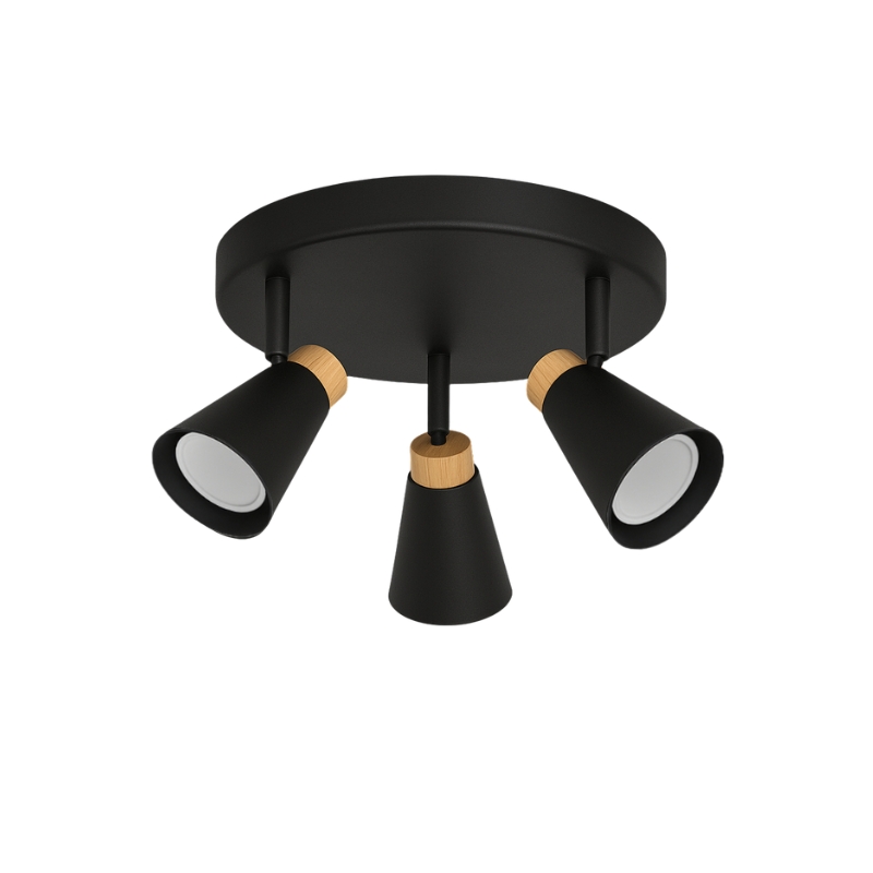 La base tiene 20 cm y 2 cm de altura. Viene con los spots cónicos de 7,5 cm de diametro y 9,5 cm de altura total.